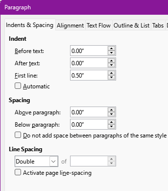 - Indent paragraphs using the auto-indent of 1/2 inch (or 1 cm)