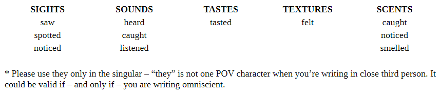 Let’s start with a definition. What are filter words? Filter words tell the reader how the detail came to the POV character’s attention. They’re indicating that a sense is being used: